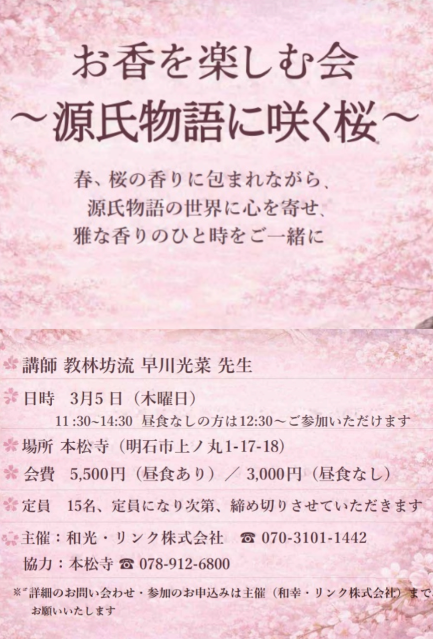 ○日 程 … 令和8年3月5日(木) ○時 間 … 11:30~14:30 定員15名 ○場 所 … 本松寺(県明石市上ノ丸1丁目17-18) ○会 費 … 5,500円(昼食あり) 3,000円(昼食なし) ※詳しい内容はパンフレットをご覧ください。