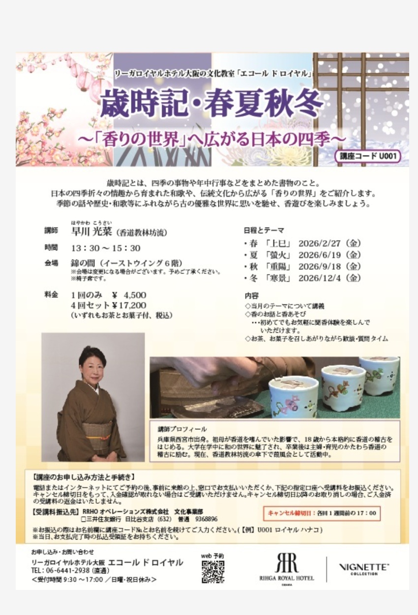 ○日 程 … 令和8年2月27日(金)、 6月19日、9月18日、12月4日 ○時 間 … 13:30~15:30 ○場 所 … リーガロイヤルホテル大阪 ○会 費 … 1回のみ 4,500円 4回セット 17,200円 ※詳しい内容はパンフレットをご覧ください。